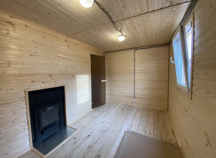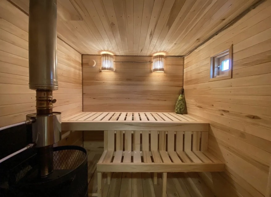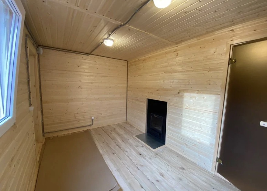 Отделывается осиновой вагонкой класс «В» , доп. обрешетка с вензазором, фольга с проклейкой швов. Монтируются осиновые, двух ярусные полоки. Для проветривания помещения устанавливается форточка размером 400х400мм. Устанавливается дровяная, банная печь «Каменка» с толщиной металла 3мм. Труба печи выводится в кровлю. Камни для печи 20кг. |