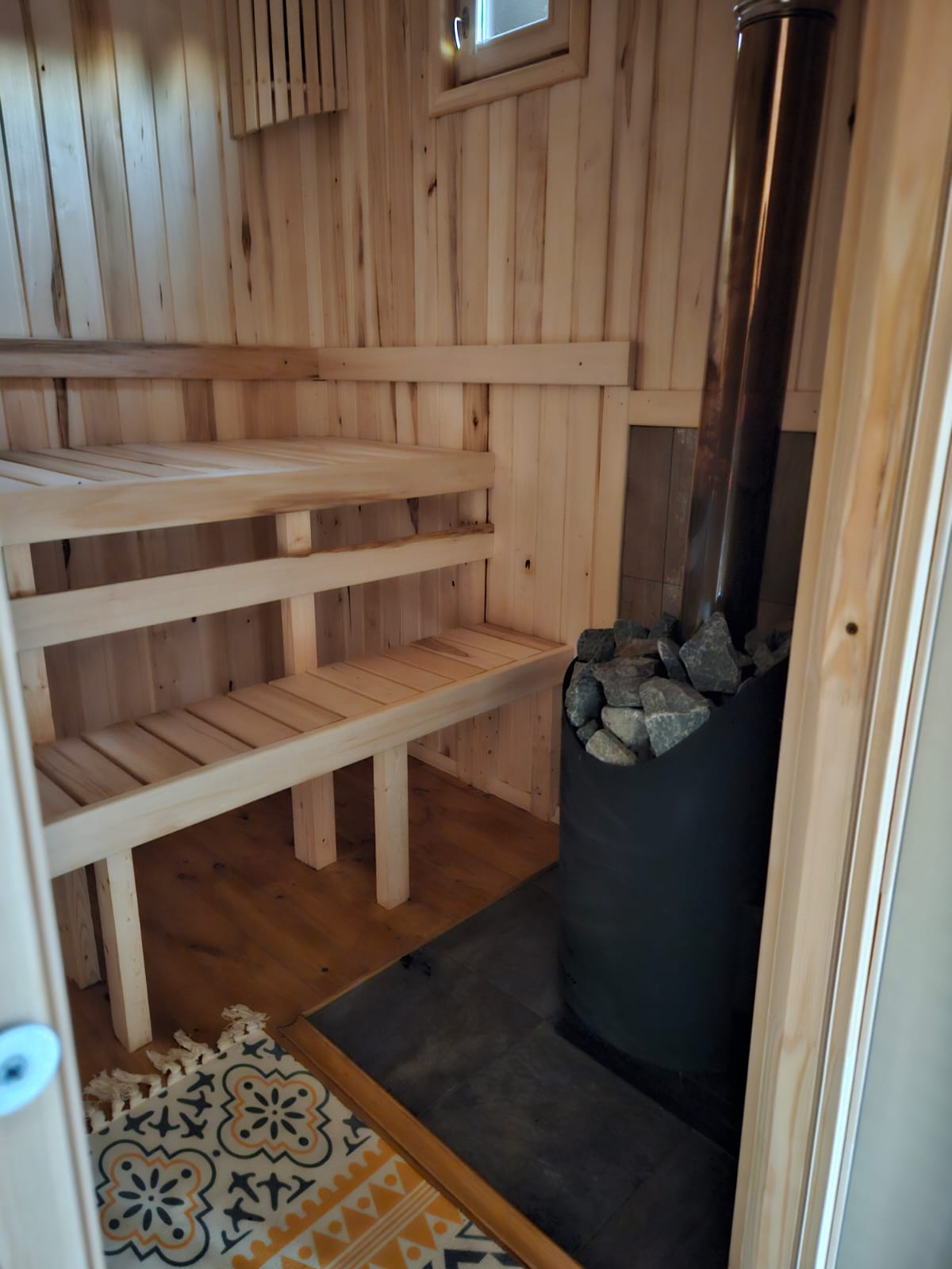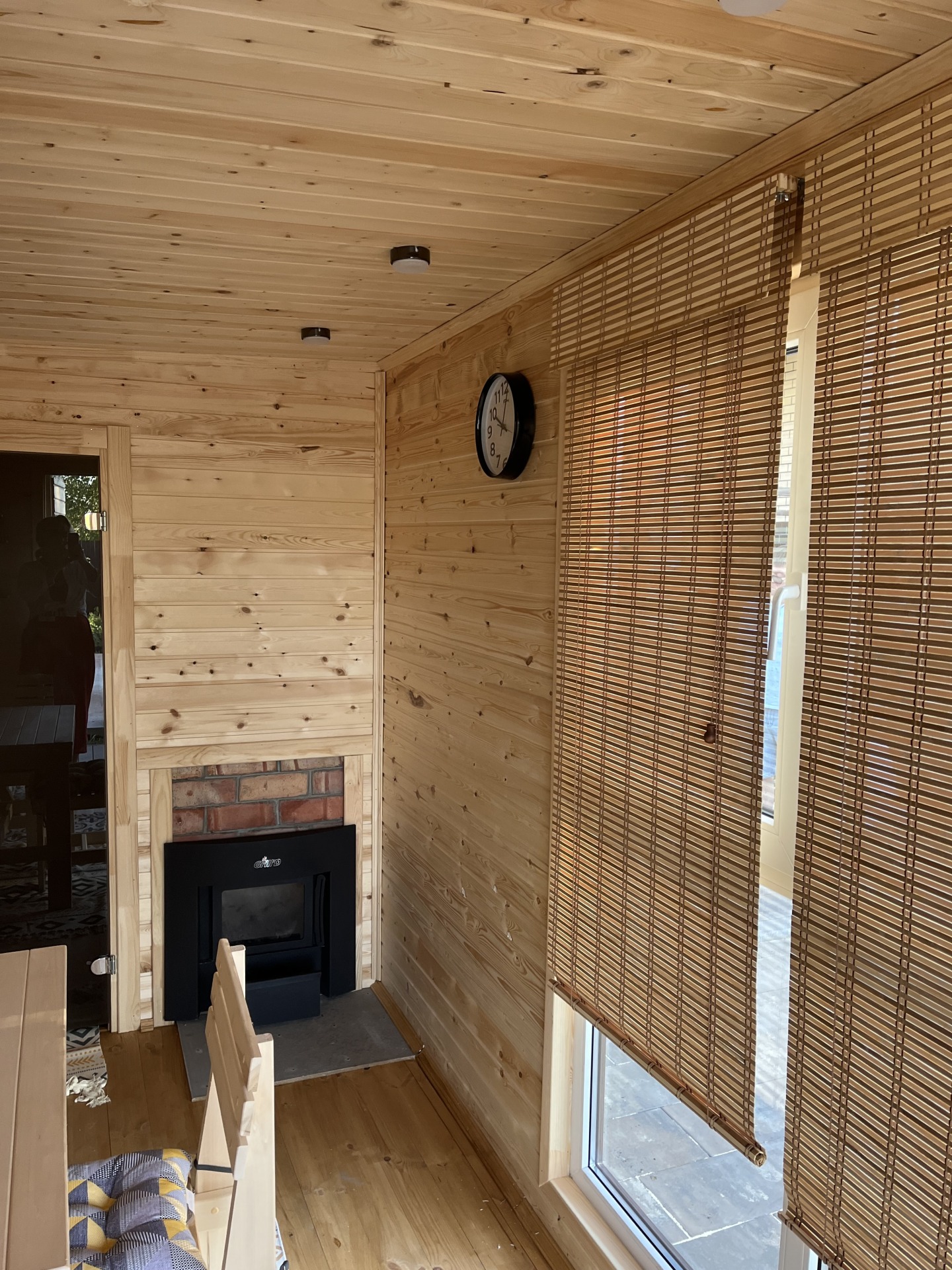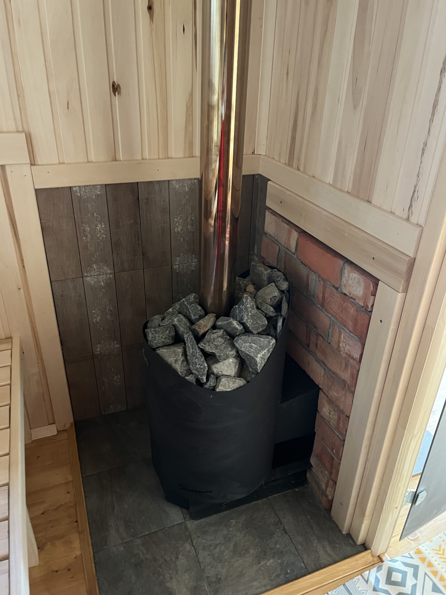 Отделывается осиновой вагонкой класс «В» , доп. обрешетка с вензазором, фольга с проклейкой швов. Монтируются осиновые, двух ярусные полоки. Для проветривания помещения устанавливается форточка размером 400х400мм. Устанавливается дровяная, банная печь «Каменка» с толщиной металла 3мм. Труба печи выводится в кровлю. Камни для печи 20кг. |