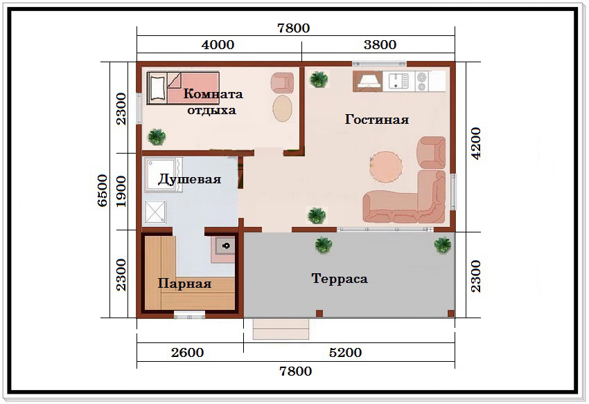Размер 50,7м2 (6,5м х 7,8м) Цена строительства из бруса 150х150 = 410 000 р. Цена строительства из профбруса 145х145 = 450 000 р. Стоимость фундамента 160 000 р. Что входит в базовую комплектацию: - Высота 1 этажа 2,5м; - Закладной венец из бруса 150 х150 мм; - Внутренние перегородки из бруса 100 х150 (95 х 145 мм - при строительстве из профилированного бруса); - Лаги пола , потолочные балки из бруса 100 х150 мм; - Устройство фронтонов из бруса 150 х150 мм; - Стропильная система из обрезной доски 50 х 150 мм; - Обрешетка крыши из обрезной доски 25 х150 мм; - Кровельный материал рубероид; - Расходные материалы (джут, гвозди, скобы).