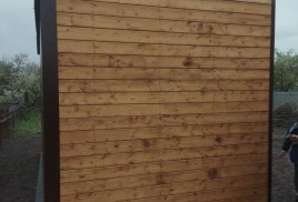Отделка снаружи - лицевая и боковые стороны: имитация бруса 21мм кат. "С" без покрытия, задняя: гофрированный лист "С8" оцинкованной стали с декоративно-защитным покрытием RAL8017, металлические доборы RAL8017.