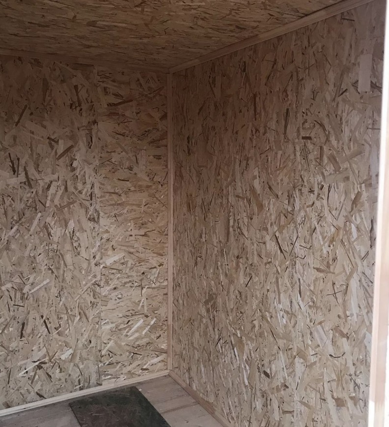 Отделка внутри - ОСБ 9 мм, плинтус дерево.