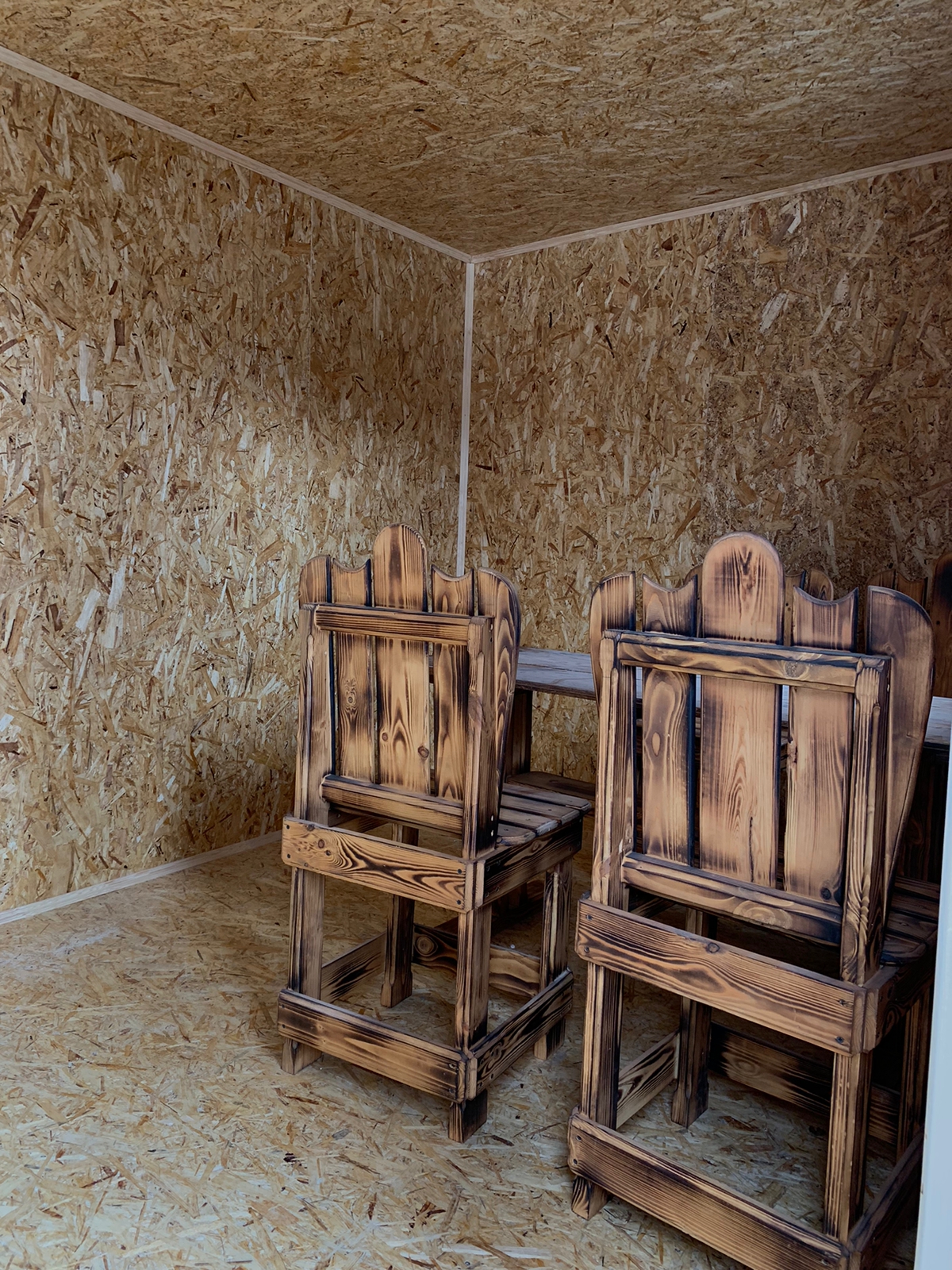 Отделка снаружи - лицевая сторона: имитация бруса 21мм кат. "С" с покрытием "Акватекс" (цвет "Дуб"), задняя и боковые стороны: гофрированный лист "С8" оцинкованной стали с декоративно-защитным покрытием RAL8017, декор (рейки) в подарок, доборы для фасада металлические RAL8017.