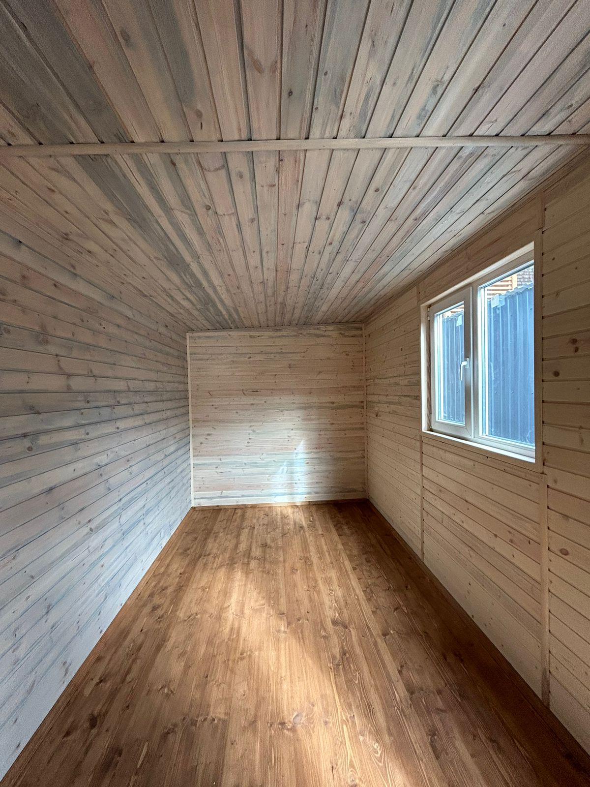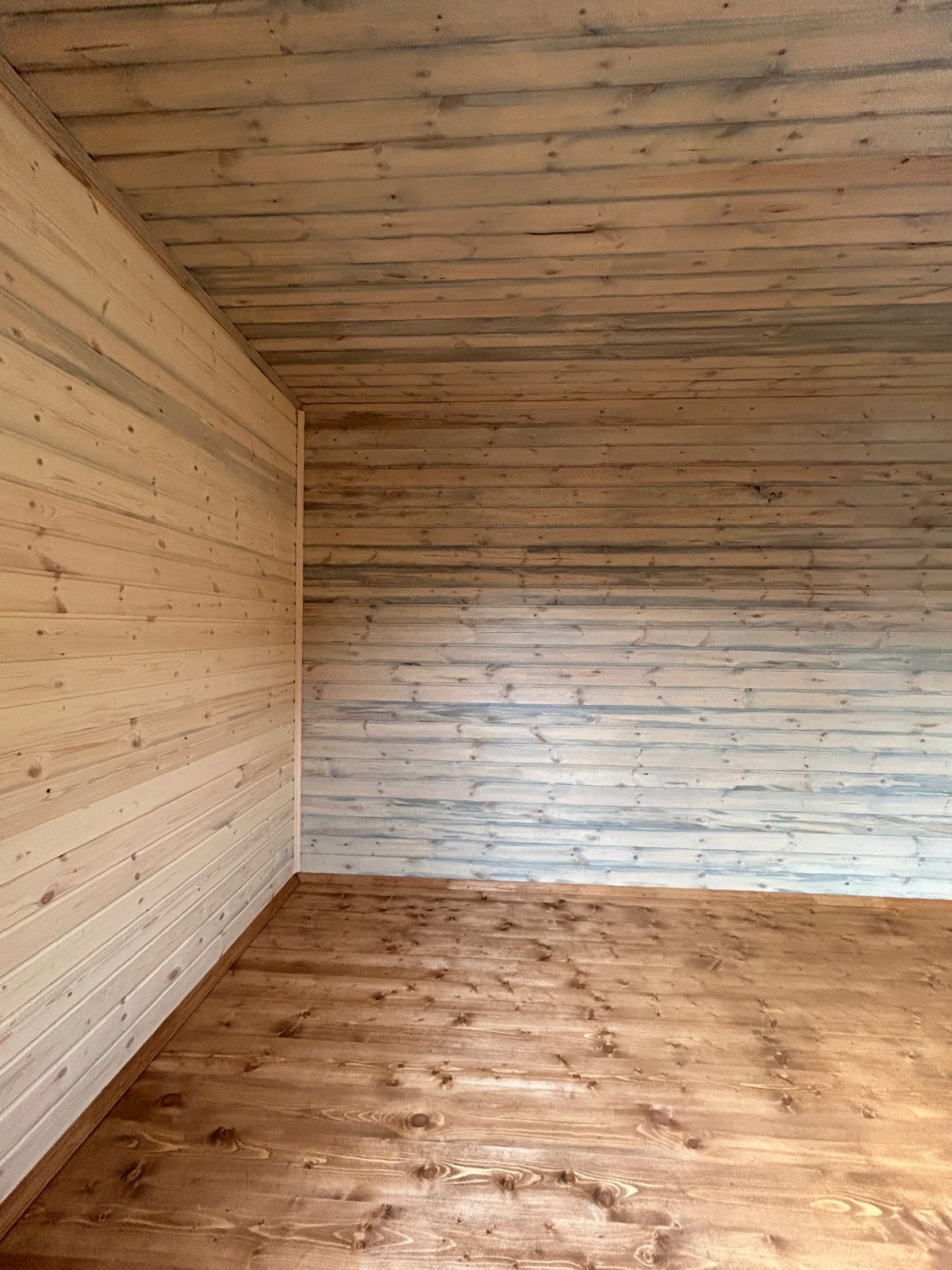 Отделка внутри - евровагонка кат. "С" с покраской Акватекс "Утренний туман", "Ваниль".