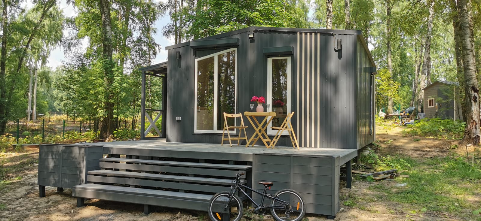 Не входит в стоимость: радиаторы, ступени, закрытие низа домика цоколем, доставка, сантехника,крыльцо, патио и лестница.