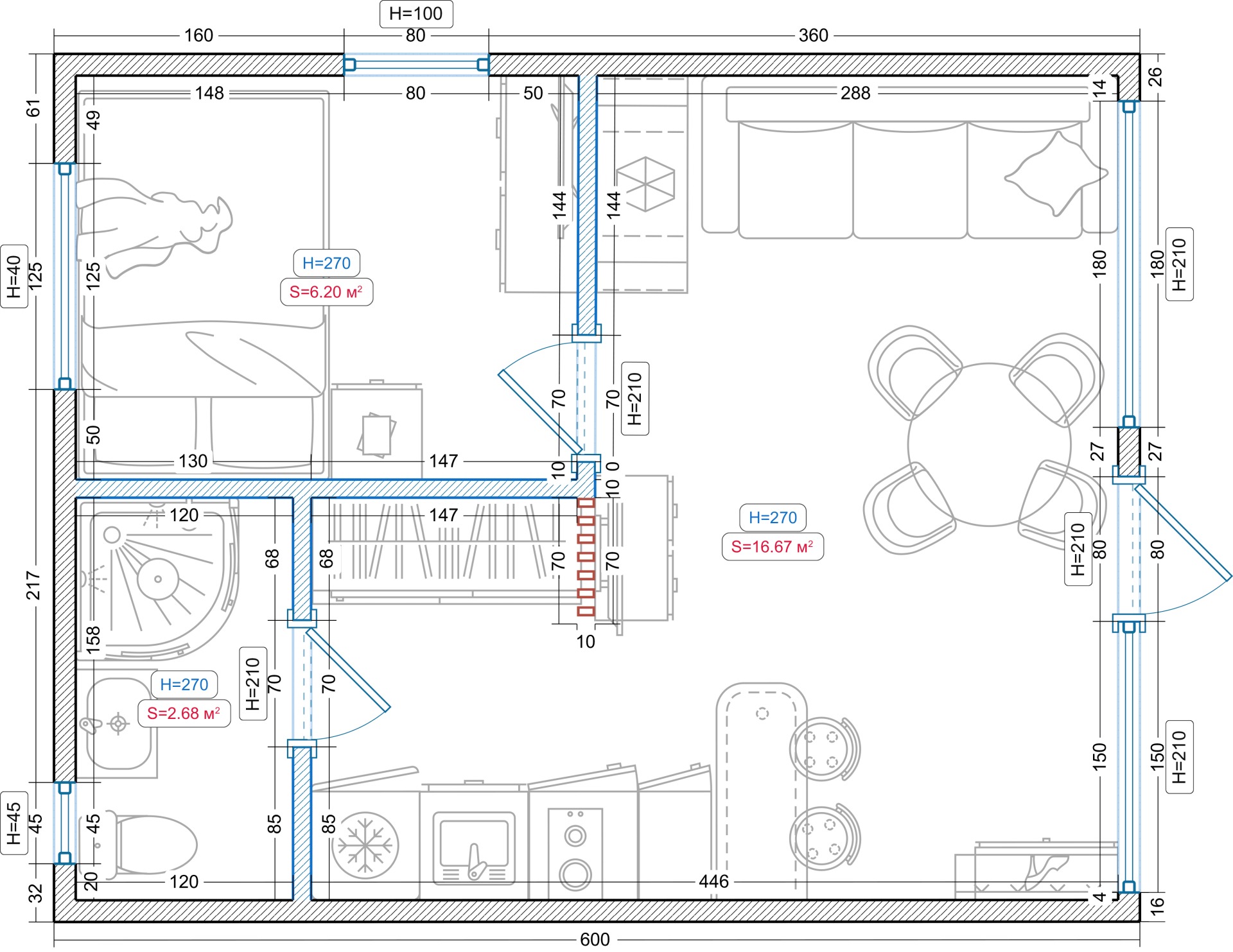 Увеличенная высота потолка: внутри - 2,7м, снаружи - 3,0м.