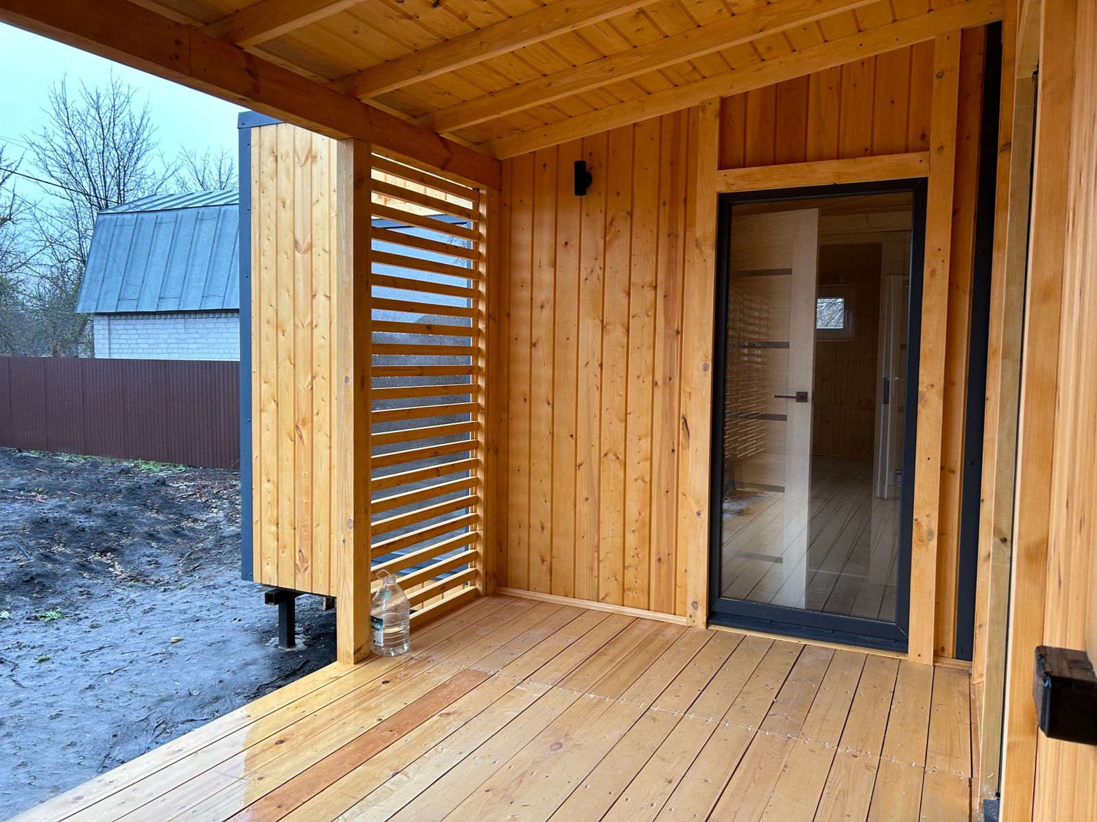 Отделка снаружи - лицевая и боковые стороны из имитации бруса 21мм кат. "С" с покрытием "Акватекс Викинг" (цвет "Калужница"), задняя сторона из гофрированного листа "С8" оцинкованной стали (0,45) с декоративно-защитным покрытием RAL7024 (Графит).