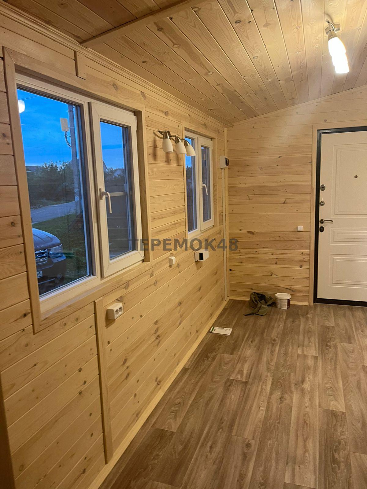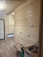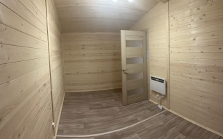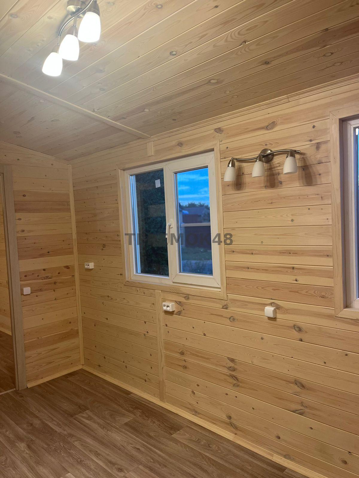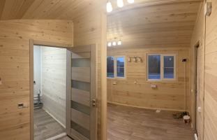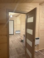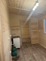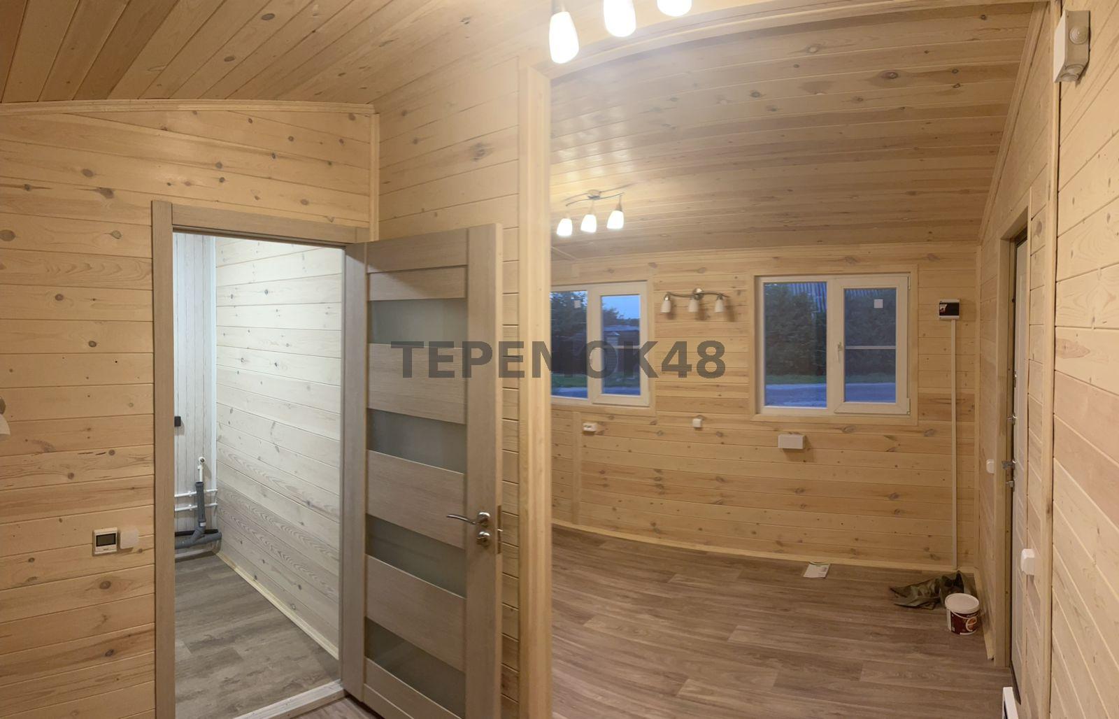 Отделка внутри - имитация бруса 21мм кат. "С" с покраской EUROTEX "Ваниль". Перегородки из имитации бруса 21мм кат. "С" без утепления.