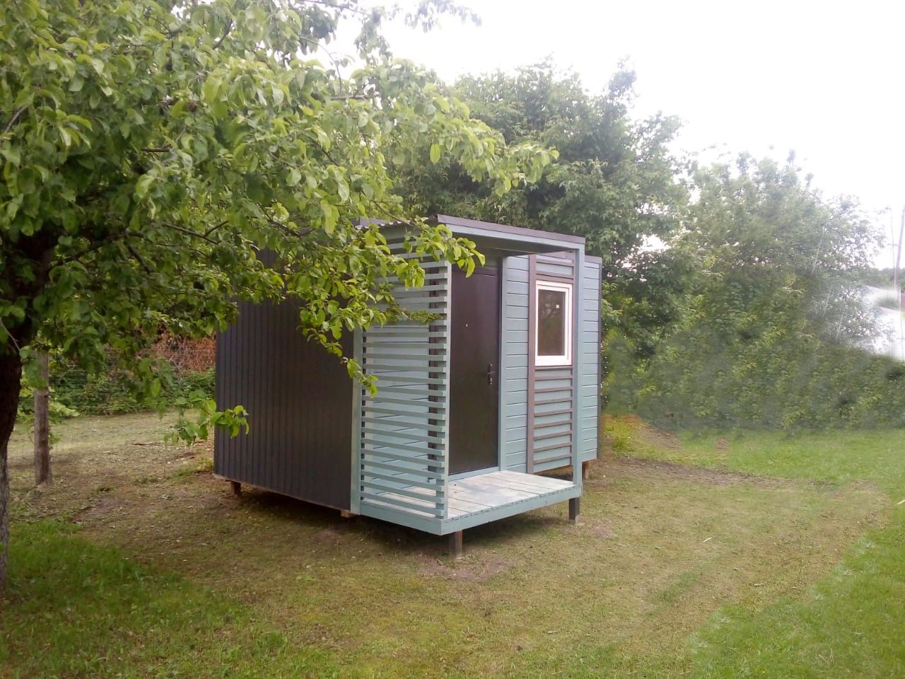 Отделка снаружи - лицевая сторона: имитация бруса 21мм кат. "С" с покрытием "Акватекс"(цвет "Северное море"), боковые и задняя стороны: гофрированный лист "С8" оцинкованной стали с декоративно-защитным покрытием RAL7024 ("Графит"), декор (рейки) в подарок, доборы для фасада металлические RAL7024.